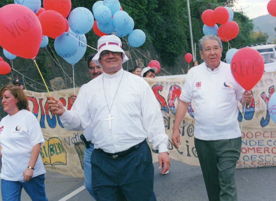 Monseñor Jorge Leonardo Gómez Serna y el padre Ramón González Parra en la Marcha por la Vida y la Paz, 1998.